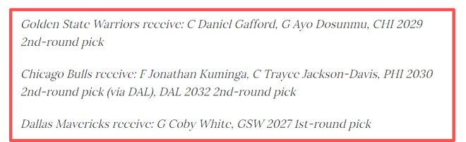 尽管与体系格格不入,但勇士对库明加的交易定价却居高不下,休赛期就曾拒绝多支球队的报价,坚持要求潜在下家拿出首轮签或优质即战力。如今,库明加已被排除在轮换之外,1月15日交易资格生效后被交易的概率超过80%,勇士也不得不认清现实,寻求通过交易将其转化为实用资产。而公牛与独行侠的参与,恰好解决了勇士的困境,也满足了自身的阵容需求,这也让三方交易的可行性大幅提升。根据多方消息汇总,这笔三方交易的具体方案已逐渐清晰:金州勇士获得丹尼尔·加福德、阿约·多苏穆以及芝加哥2029年第二轮选秀权;芝加哥公牛获得库明加、特雷斯·杰克逊-戴维斯、2030年费城第二轮选秀权(通过独行侠)以及达拉斯2032年第二轮选秀权;达拉斯独行侠获得科比·怀特以及勇士2027年首轮选秀权。