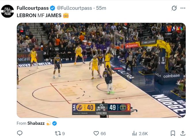 末节老詹两次出手未能命中,但他送了两个助攻湖人已经扳平分差,詹姆斯被换下后东契奇单核带队斯玛特连拿6分,詹姆斯还剩4分钟回归一个上篮打铁,随后篮下转身造犯规两罚一中,湖人前场失误送6分,老詹关键的平框暴扣,随后掘金犯规战术比赛走向完结。
