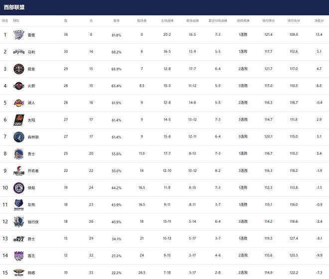 1-3名:雷霆(36胜8负)、马刺(30胜14负)、掘金(29胜15负)