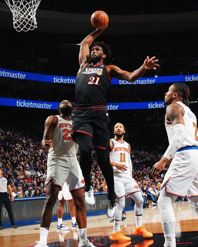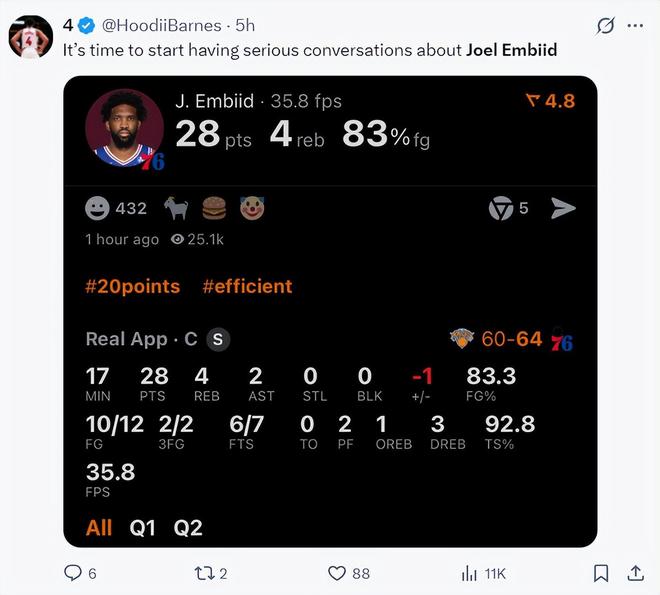 布伦森全场比赛38分钟,24中11,三分12中6,拿到31分6助攻5篮板,命中率45.8%,三分命中率50%。实际上恩比德的表现比布伦森更出色,效率也更高。
