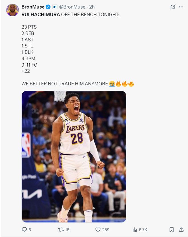 湖人媒体:此役打完后大家觉得八村是否值得球队长期留用?还是说湖人该在交易截止日前利用他的合同进行交易换取更好的球员?还是继续留着跟他续约?