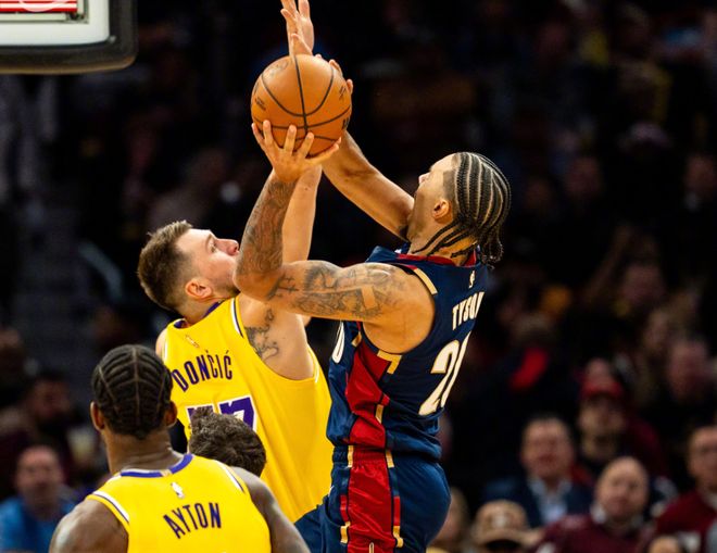 湖人顺风顺水,很快拉开10分分差。但中段骑士也开始发力,波特和阿伦轮流扣篮,泰森飞身上篮+弧顶接球三分,湖人还是老问题,内线防守对抗和护框都不够,一收缩又让对手外线出现大空位。海斯空接止血后,波特带着骑士继续发力,泰森续上三分,老詹情绪有点不对,泰森弹无虚发,老詹则被吹进攻卡位犯规,半场结束时,湖人55-57骑士。进入第三节,米切尔内突外投,阿伦肆虐篮下,韦德也续上三分,湖人进攻全线哑火,只剩东契奇苦撑。中段韦德继续扔三分球,泰森溜底线暴扣+反击飞身上篮,老詹又失误+无球进攻犯规!