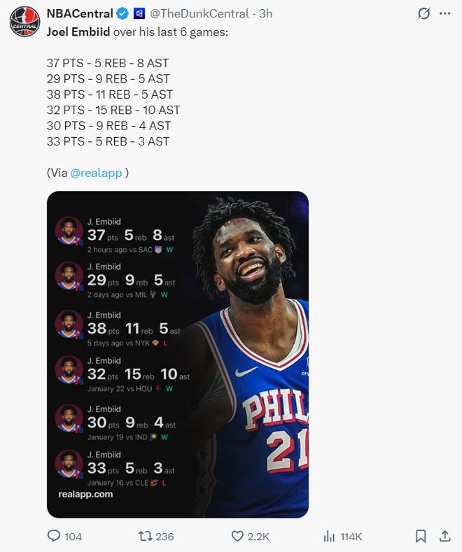 过去的6场比赛恩比德拿到了5次30+,场均35.6分钟,拿到33.2分9篮板5.8助攻0.5抢断0.7盖帽,命中率54%,三分命中率50%,罚球命中率86.2%。