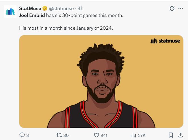 此役后大帝再度创造多项纪录:1.本月恩比德已经拿到6次30+,这是他2024年1月后最多30+表现;
