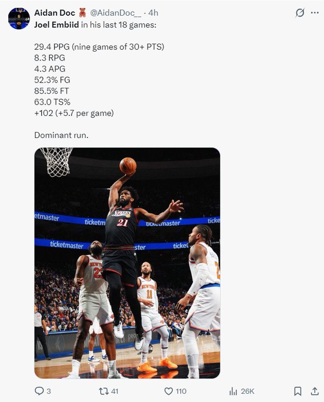 过去的18场比赛,恩比德场均拿到29.4分8.3篮板4.3助攻,命中率52.3%,真实命中率63%,正负值+102,恩比德真的回到巅峰状态了。
