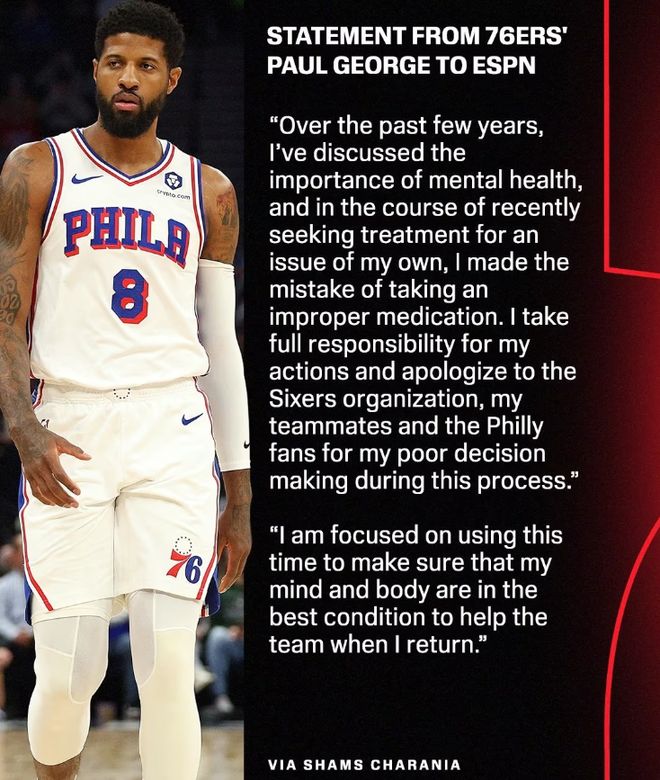 乔治通过ESPN记者Shams Charania发布了一份个人声明,解释自己是在寻求心理健康治疗时“犯了错误,服用了不合适的药物”。他对此承担全部责任,并向球队、队友和球迷道歉。