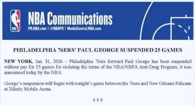 然而,就在今天,76人收到了联盟的一纸罚单,瞬间将所有期待粉碎。NBA官方发布重磅处罚:费城76人队前锋保罗·乔治因违反联盟反兴奋剂条例被禁赛25场!