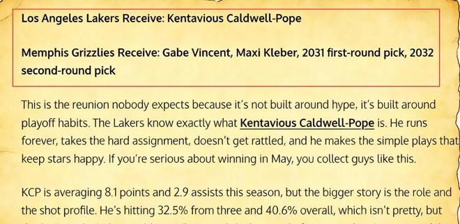 美媒《Fadeaway World》便提出了这样一笔“小修小补”式的交易方案,他们建议湖人送出文森特、克莱伯、2031年的首轮签以及2032年的次轮签,从灰熊引入后卫波普。