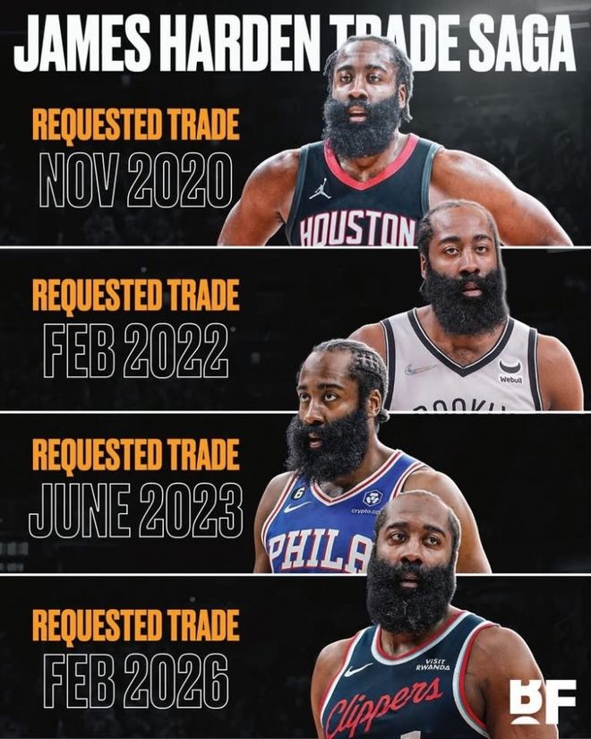 北京时间2月3日,根据名记Shams的报道,詹姆斯-哈登主动申请离开洛杉矶快船。随后,美媒晒其四次申请交易图:这哥们在哪都不开心