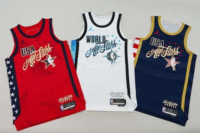 三款球衣各具特色:美国队两款分别为印着星星图案的红色球衣、印着条纹图案的蓝色球衣,世界队则是一件点缀地球图案的白色球衣。这三款设计独特的球衣均由乔丹品牌打造,球衣背面号码上方还会印有球员的本国国旗。该系列球衣的球迷版本将于美国东部时间周三上午10点,在NBA官方商城开售。