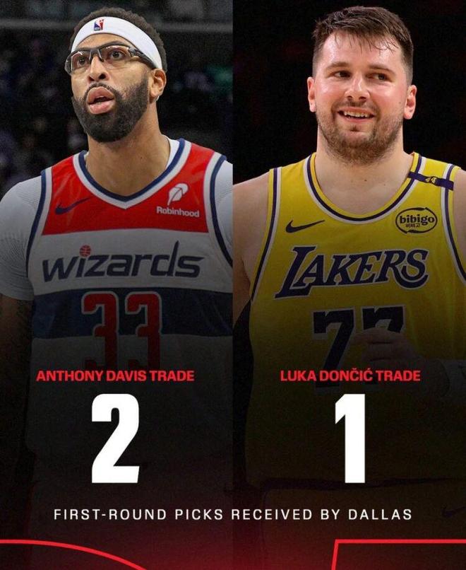 值得一提的是,在今天的安东尼·戴维斯交易中,独行侠获得了两个首轮选秀权,比去年二月交易卢卡·东契奇时多一个。
