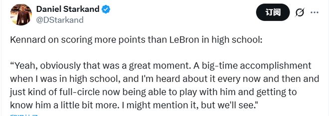 有美媒报道,肯纳德高中生涯得到2977分,甚至高于詹姆斯的高中生涯(2657分)。谈及高中时期得分比詹姆斯多,肯纳德表示:“当然,那是段超棒的回忆,也是我高中时的一大成就。直到现在偶尔还会有人提起这事,如今能和他并肩作战、慢慢更了解他,感觉一切都很圆满。我或许会跟他提提这事,不过看情况吧。”