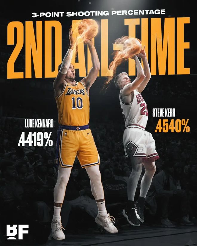 肯纳德的到来将为湖人补上迫切需要的外线火力。他的职业生涯三分命中率高达44.2%(联盟历史第二,仅次于科尔的45.4%),本赛季至今更是以49.7%的三分命中率高居联盟榜首。