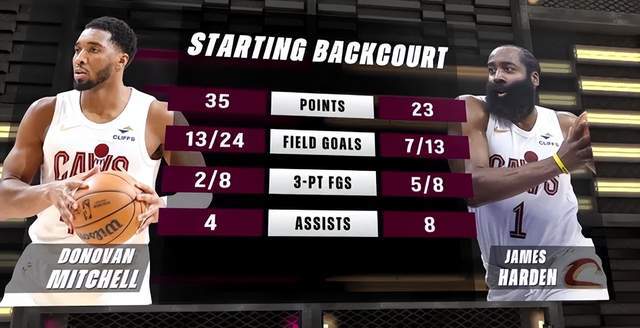 哈登出战32分钟,13投7中,其中三分球8投5中得到23分2篮板8助攻1抢断。米切尔出战34分钟,投篮24中13,三分球8中2,罚球7中7,得到35分2篮板4助攻2抢断2盖帽。哈登组织控场,米切尔攻坚得分,有点像21年打进总决赛的太阳配置了。当时太阳就是以保罗和布克为双枪,保罗发牌,布克攻坚。