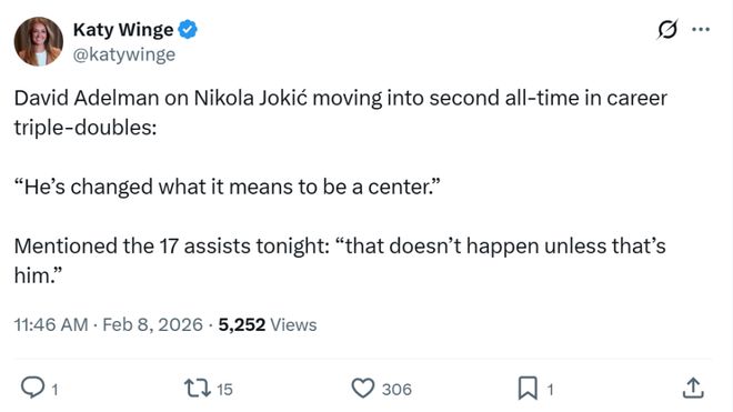 掘金主帅小阿德尔曼谈及约基奇全场17次助攻时坦言:“他重新定义了中锋的意义,也就是他,否则这种情况不会发生。”