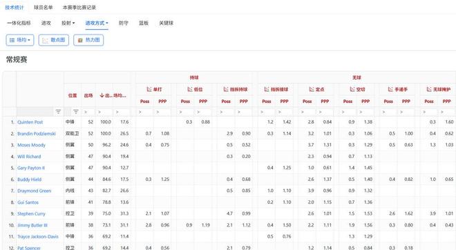 听上去似乎没什么好炫耀的,但实际上对现在的勇士来说极为稀缺。上图是勇士本赛季出场率在60%以上球员的持/无球进攻效率图,一眼望去全是嗷嗷待哺的工具人,真正能扛起持球进攻产量和质量的得分手只有巴特勒和库里。