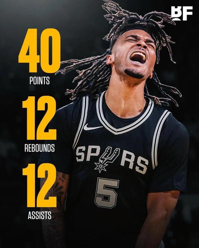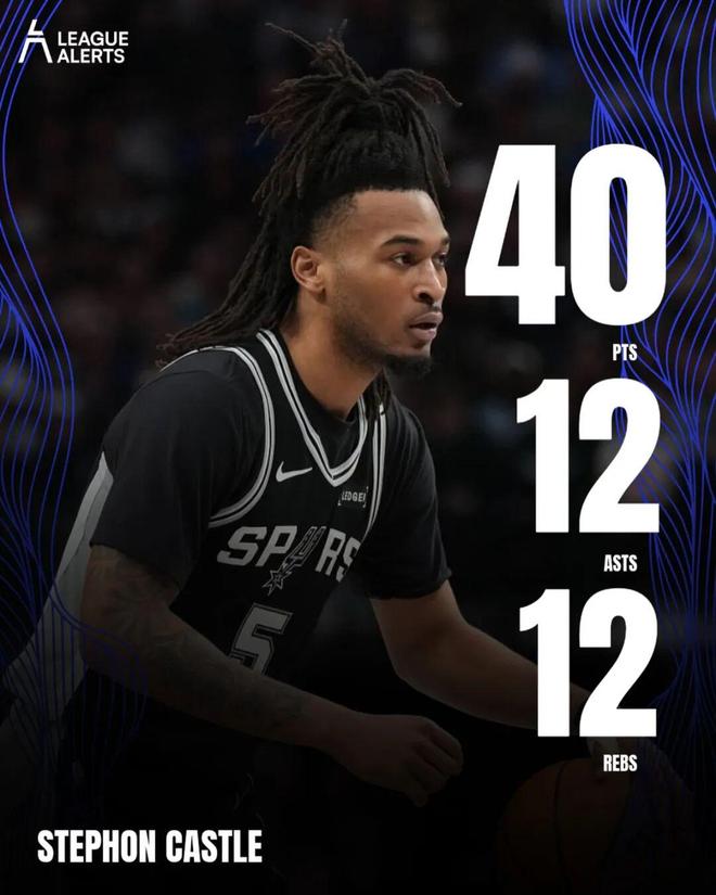 这场比赛,马刺后卫卡斯尔打出了生涯之夜:全场出战31分钟,投篮19中15,三分5中3,罚球10中7,拿下40分12篮板12助攻3抢断。