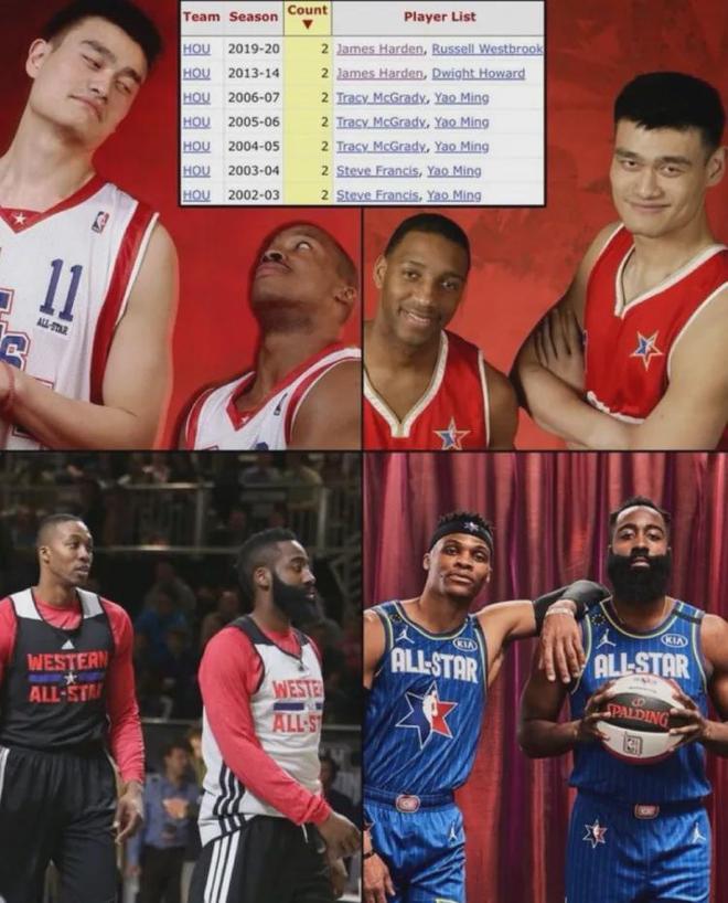 而且申京在今年全明星不会孤单,因为有好大哥杜兰特陪伴,两人成为火箭队史自1997年以来第五对同赛季入选全明星的队友,此前四对分别是姚明/弗朗西斯、姚明/麦迪、哈登/霍华德,以及哈登/威少。