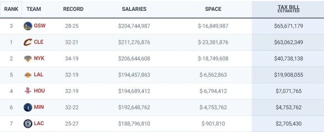 勇士6567万力压骑士6306万继续霸占榜首,尼克斯4074万奢侈税,湖人、火箭、森林狼、快船的奢侈税则分别是:1991万、707万、475万和271万。