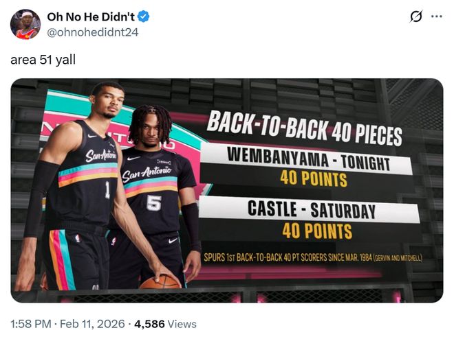因为不仅是文班,卡斯尔、哈珀与卡特布莱恩特三大新星的表现也是可圈可点,过去两场文班与卡斯尔连续砍下40+成为马刺自1984年格文和迈克-米切尔后,首对在连场砍下40+的双人组。