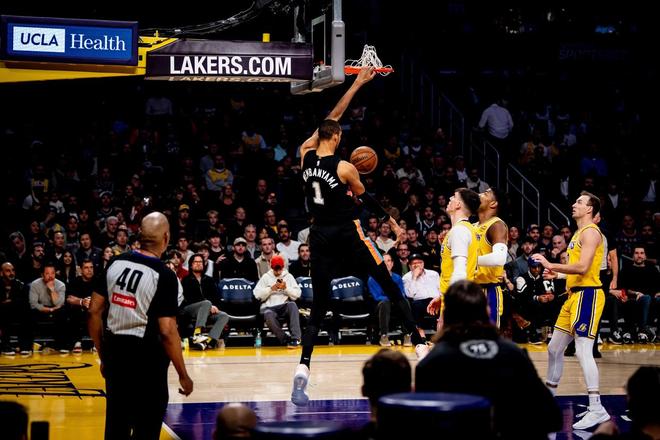 哈珀上篮得分,布莱恩特2罚不进,克莱伯跳投得手。文班亚马助攻布莱恩特暴扣,布朗尼跳投打铁,福克斯助攻文班亚马空接扣篮。布朗尼回敬三分球,文班亚马2罚全中,半场打完,马刺以84比55领先,湖人单节以25比37落后。文班亚马单节8中4得到了12分,布莱恩特14分。需要关注的是,残阵湖人让马刺在上半场轰下84分,创下紫金军团本赛季半场失分纪录。