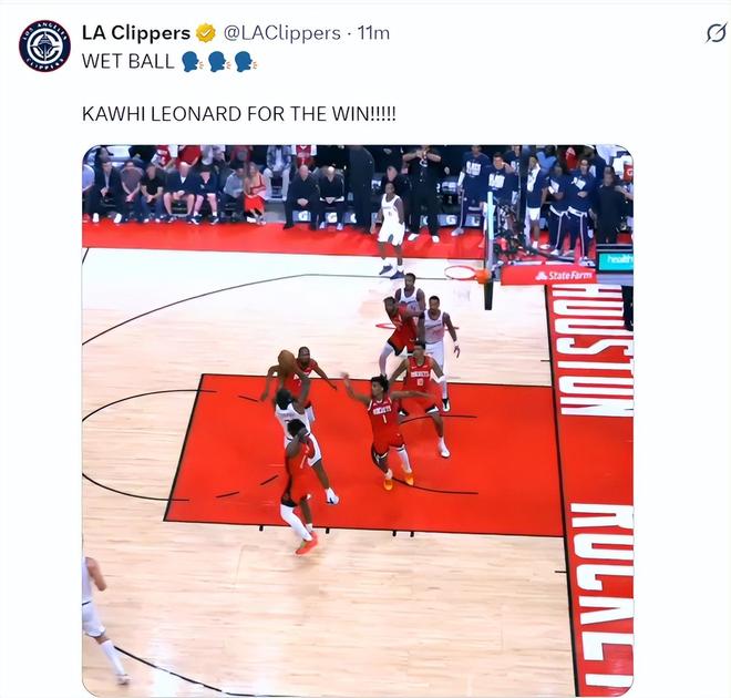 快船队官方反复的回放了小卡这个终场前7.2秒发动的准绝杀球,他是在面对火箭锋线最好的防守者阿门-汤普森时投出去的,阿门明显被小卡晃开了防守重心。