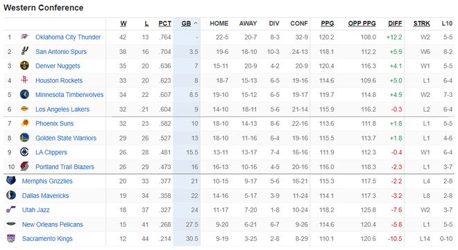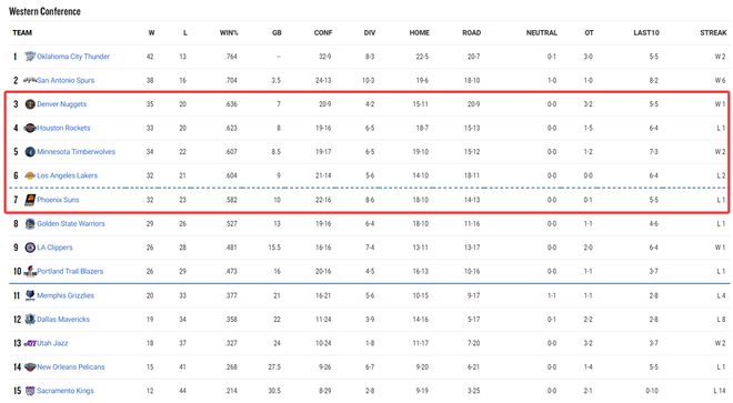 太阳作为西部第七只落后湖人1个胜场,太阳领先西部第八的勇士3个胜场,勇士则领先快船2.5个胜场。