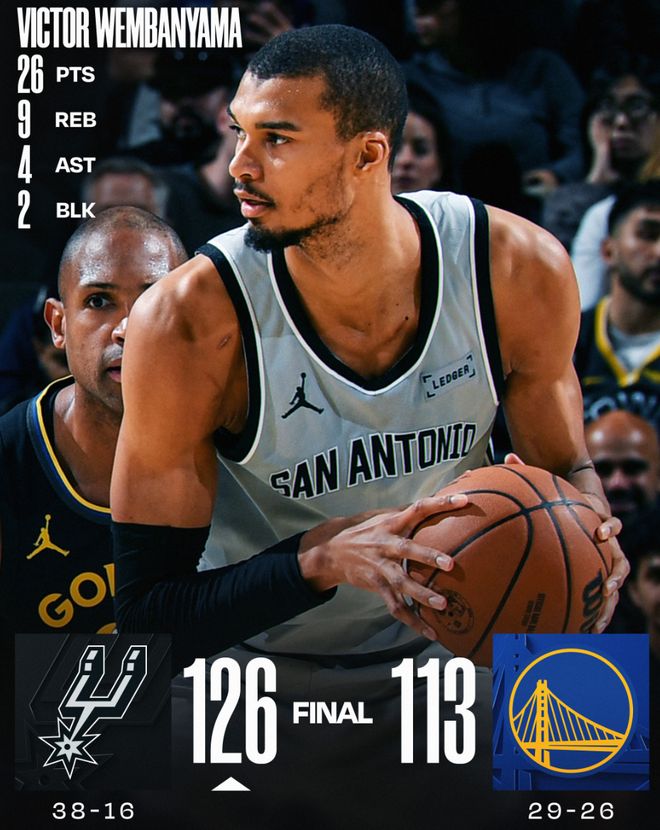 马刺队逆转大胜勇士后已经拿到6连胜,文班亚马拿到26分9篮板1抢断1盖帽,文班亚马背靠背拿到66分21篮板,马刺跟雷霆已经与其余的西部球队拉开一个档次。