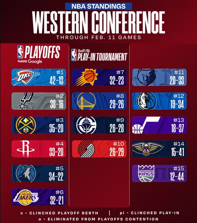 北京时间2月12日NBA常规赛打完,休斯顿火箭队刚刚坐了一天的西部第三又下落到西部第四,而且掘金击败灰熊后跟火箭再度拉开了1个胜场差,雷霆则拿到2连胜,马刺则拿到6连胜,两支西部前二的球队胜场差依旧是3.5个胜场。