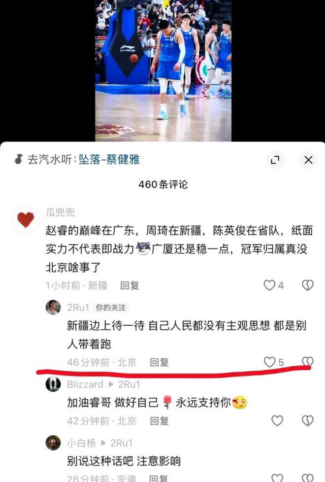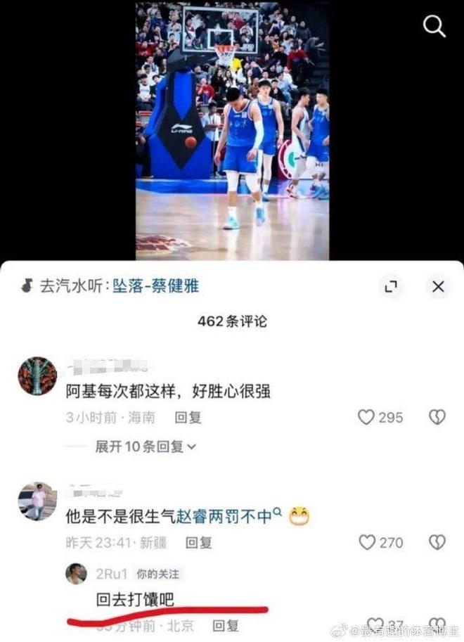 赛后,面对新疆球迷评论:“赵睿两罚不中是不是很生气”,赵睿直接开怼:“回去打馕吧!”
