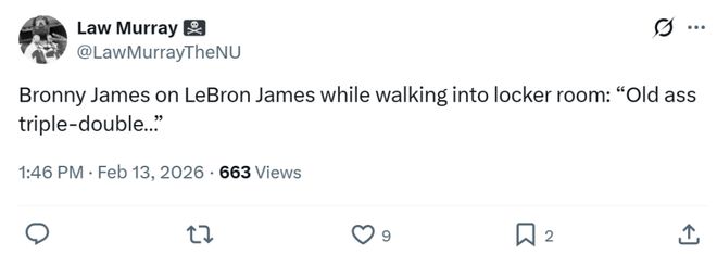 儿子布朗尼也在赛后更衣室中对父亲詹姆斯说道:“老家伙的三双(Old ass triple-double)。”