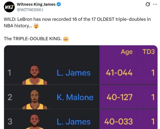 纪录二:本场比赛是詹姆斯本赛季首次拿到三双,这让41岁45天的詹姆斯超越03年40岁127天马龙创造的NBA历史纪录,成为NBA历史上拿下三双最老的球员。