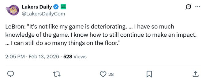 詹姆斯本人在狂刷历史之最的纪录后,赛后谈及自己漫长的巅峰期时霸气发声:“我从未因为选择篮球而后悔,自从打球以来,我一直很出色,只要我想火力全开,就能快速进入状态。”