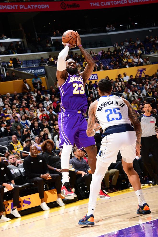 在首节最后阶段独行侠反超比分,詹姆斯连投带罚再得4分,他首节9分钟就贡献7中5,其中三分4中2与罚球3中2,高效达到14分6助攻全能数据。
