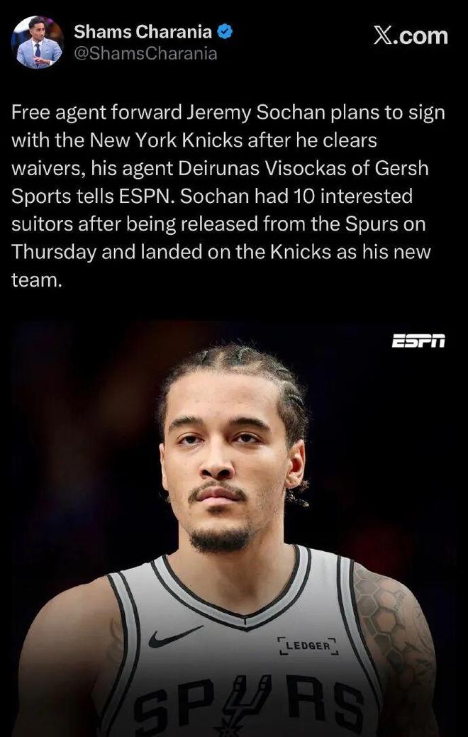 索汉和托马斯一样,进入买断市场就立刻有新东家接手,已经决定加盟身处国际大城市纽约的尼克斯。