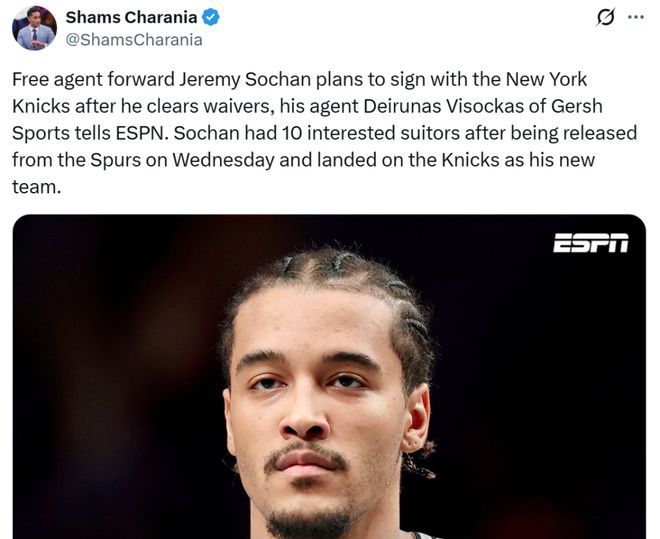 马刺队裁掉索汉后,这名22年9号秀一口气获得10支球队的签约意向,最终索汉选择加盟尼克斯,名记Shams曝出索汉将在度过澄清期后与尼克斯签约。