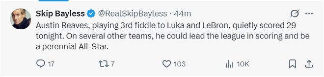 NBA名嘴斯利普-贝勒斯写道:在詹姆斯、东契奇的身边都能拿29分,如果他换一支球队他有机会拿到得分王,并且有希望常年进入全明星阵容。
