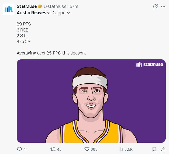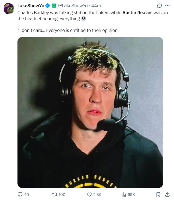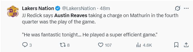在赛后巴克利不断地在ESPN的直播间诋毁湖人,说湖人根本不是夺冠球队。里夫斯则在直播间回应:我根本不在乎别人的看法,每个人都有发表自己想法的机会。