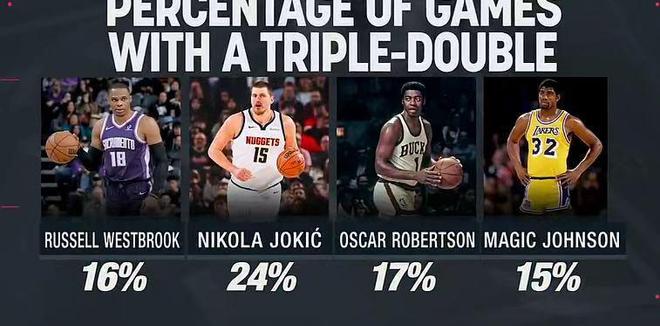 约基奇本赛季21次三双高居联盟第一,生涯185次三双历史第二,仅次于威少207次三双,生涯三双率高达24%。