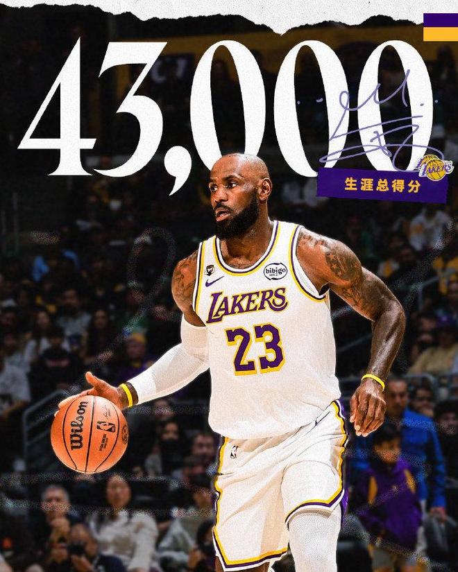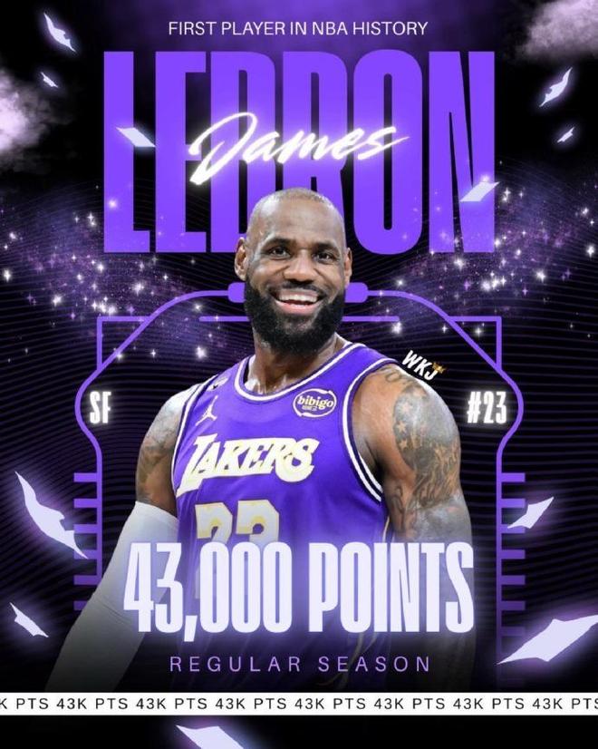 詹姆斯达成NBA生涯常规赛43000分里程碑,创造历史第一纪录。
