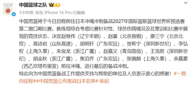 男篮世界杯亚洲预选赛第二窗口期将至,春节期间仍然在刻苦集训准备的中国男篮,敲定了14人名单,这支队伍将前往冲绳,继续备战与日本队的关键战役。此番出征,身为主教练的郭士强选择了6后卫、5锋线、3内线的搭配,这也是教练组综合对手特点、球员集训中竞技状态和伤病情况的选择。