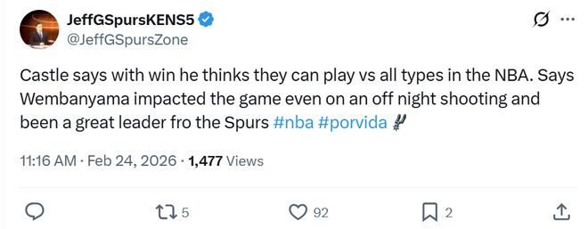 面对文班这样的表现,赛后卡斯尔称赞到:“文班是马刺的领袖,哪怕手感不佳,他也能对比赛带来巨大的影响。”