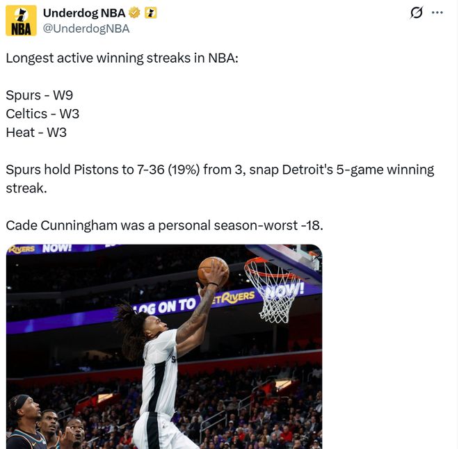 马刺队击败活塞后,帮助雷霆队反超活塞重返联盟第一的同时,也将自己领先西部第三掘金的差距拉开到5.5个胜场之多,同时将落后联盟第一雷霆的差距缩小到2.5个胜场。