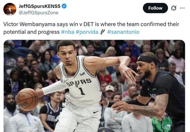 文班则认为本场击败联盟第一活塞是团队的胜利,每个人都在这场比赛中有所贡献,同时本场胜利是马刺证明自身实力和取得进步的重要时刻。