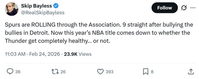 名嘴Skip则表示马刺队势如破竹,不仅拿下9连胜,还击败了联盟第一活塞,现在压力给到雷霆队,能否保持健康将决定本赛季NBA冠军的归属。