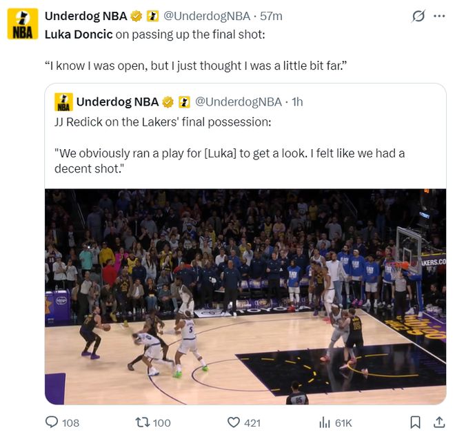这场比赛卢卡-东契奇错失了一个绝佳的三分出手机会,他居然将这个空位机会传给了底角更远的詹姆斯,结果詹姆斯扭着身子出手不中。