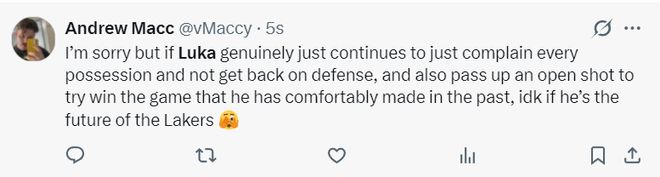 湖蜜:东契奇只是不停抱怨每一次进攻没哨,他还不及时回防,错失了一个轻松得分的机会,我真的要质疑他是否能成为湖人的未来之星了。