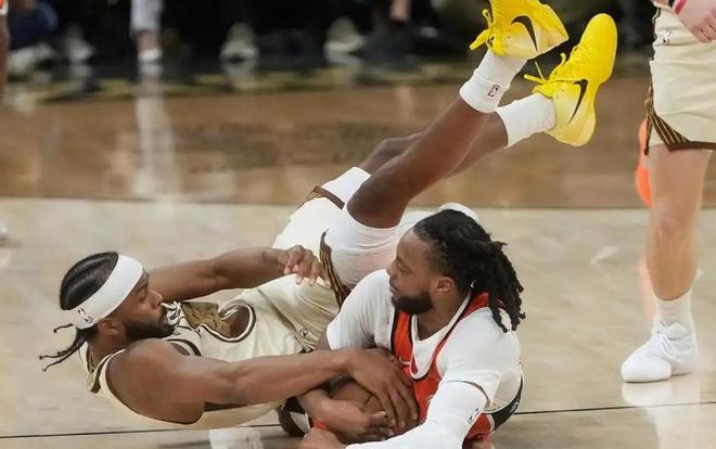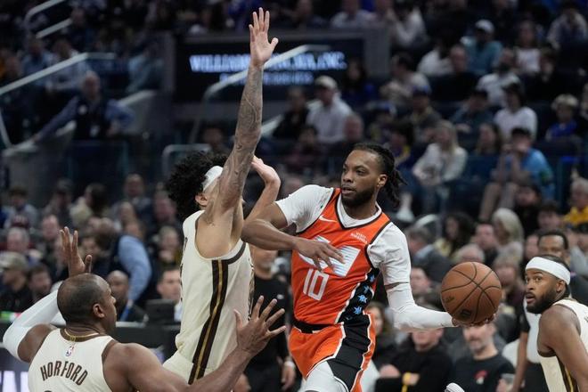 上半场,就是另外的极端。莱昂纳德和加兰的上场时间被错开,天赋平庸的加兰,又被扔到了单核带队的环境。只能说,加兰确实扛起了球星的责任,但他实在很难做出实质的贡献。他只会在勇士凶悍的夹击撕咬下,不停地失误。他只会在凶狠的一线领防下,不断三分打铁。在前赴后继的围剿下,加兰只会暴露天赋的平庸,组织能力优秀的特点发挥不出来,一个人几乎带崩快船整支球队。