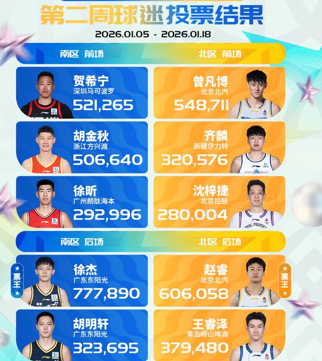 全明星赛第二周票数公布,这一周的票王还是没有改变。特别是对于徐杰来说,他不仅是南区的票王,还是全部球员中票数最多的一个球员了,甚至比北区票王赵睿还要多17万,这样的优势非常大了。当然最近徐杰的状态确实糟糕,希望这种支持可以让徐杰的状态回暖一些吧。赵睿还在伤停阶段,如果正常的话,全明星还是可以打的。