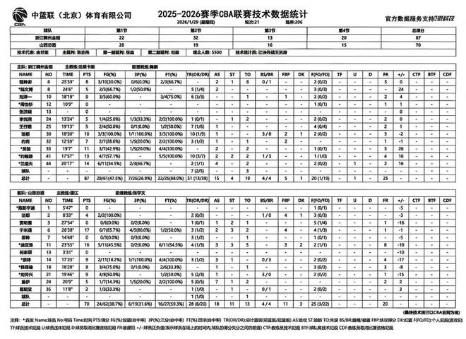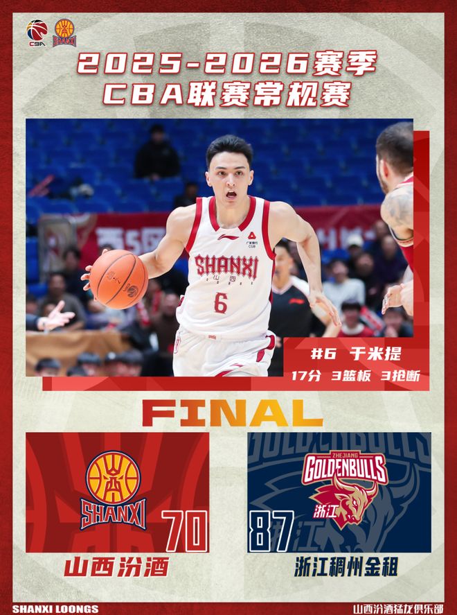 北京时间2026年1月29日19:35,2025-2026赛季CBA联赛常规赛第21轮继续进行,山西汾酒客场挑战浙江稠州金租。两队历史上共交手46次,山西汾酒21胜25负,上赛季常规赛两队交手4次,山西汾酒2胜2负;本赛季两队交手1次,山西汾酒1胜0负。本场比赛,山西队自身发挥不佳,进攻端起伏不定,篮板球输给对手23个,最终全场比赛结束,山西汾酒70:89不敌浙江稠州金租。赛后潘江指导一针见血,输球并不可怕,可怕的是输掉斗志。希望大家尽快振作起来,重拾信心,继续前进!
